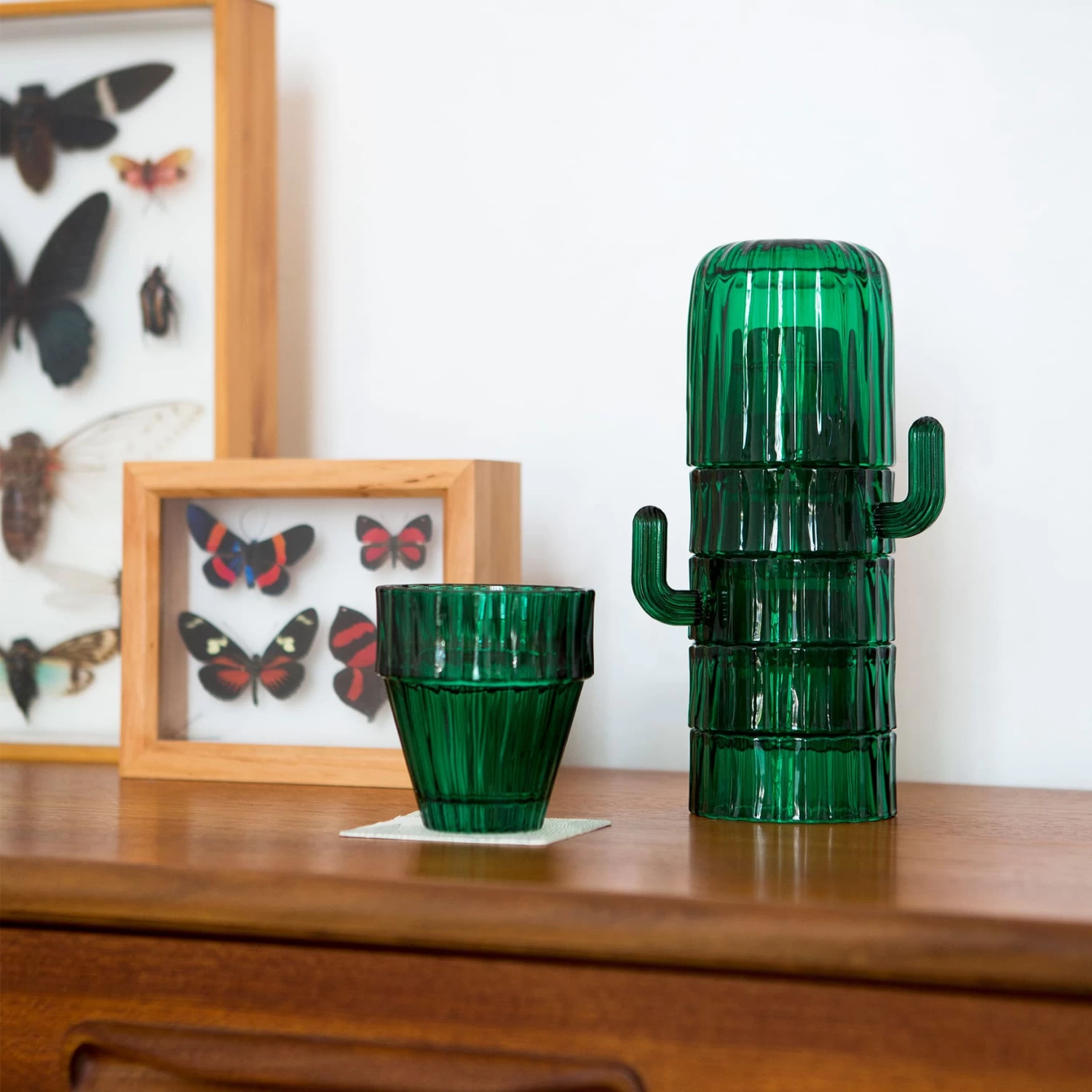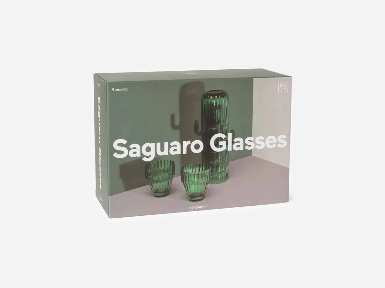 Set of 6 stackable glasses by DOIY with different shapes that feature a saguaro cactus once piled up. It is decorative, surprising and useful for any home.