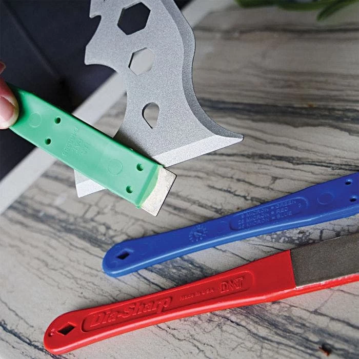 The kit includes three color coded grits in Green 9: extra fine, Red: fine and Blue 45: coarse. Thin easy-access tip for use in tight corners, ergonomically designed hourglass-shaped handle for superior comfort and control Three great sharpeners, one price.