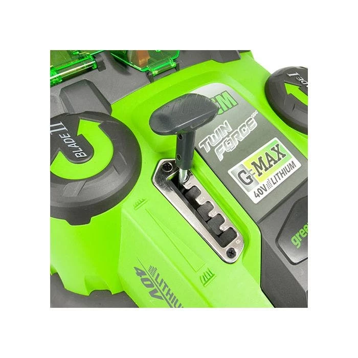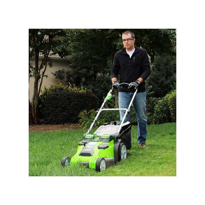 The GreenWorks G-MAX 40V Li-Ion Cordless Mower’s 2-in-1 feature offers versatile use with mulching and rear bagging capabilities, 20in cutting deck and a cutting height range from 1-3/8in to 3-3/8in. Includes 40V 4Ah and 2Ah Li-Ion batteries and charger, rear discharge bag, mulch plug, isolator key and owner’s manual. Up to 70 minute run time.