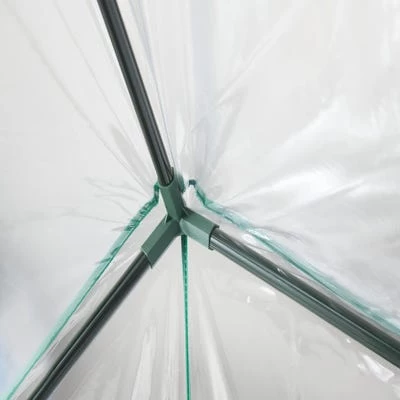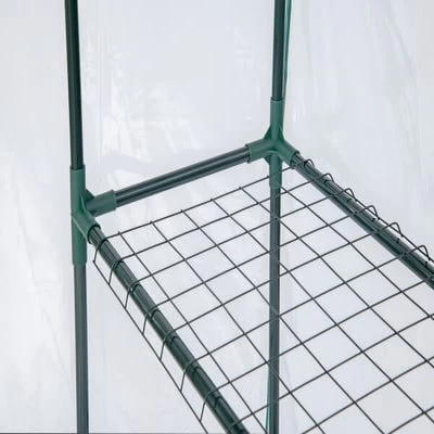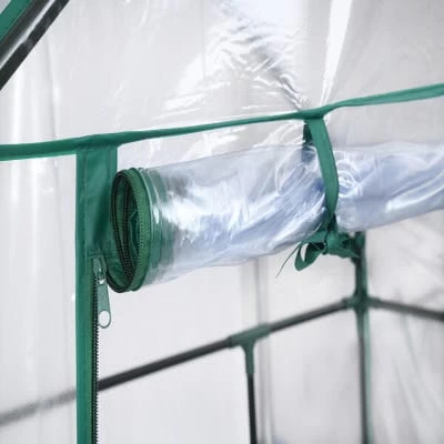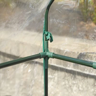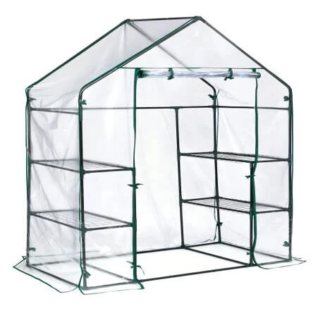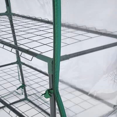 - The greenhouse has a fitted clear PVC cover with integrated tie-downs.nn