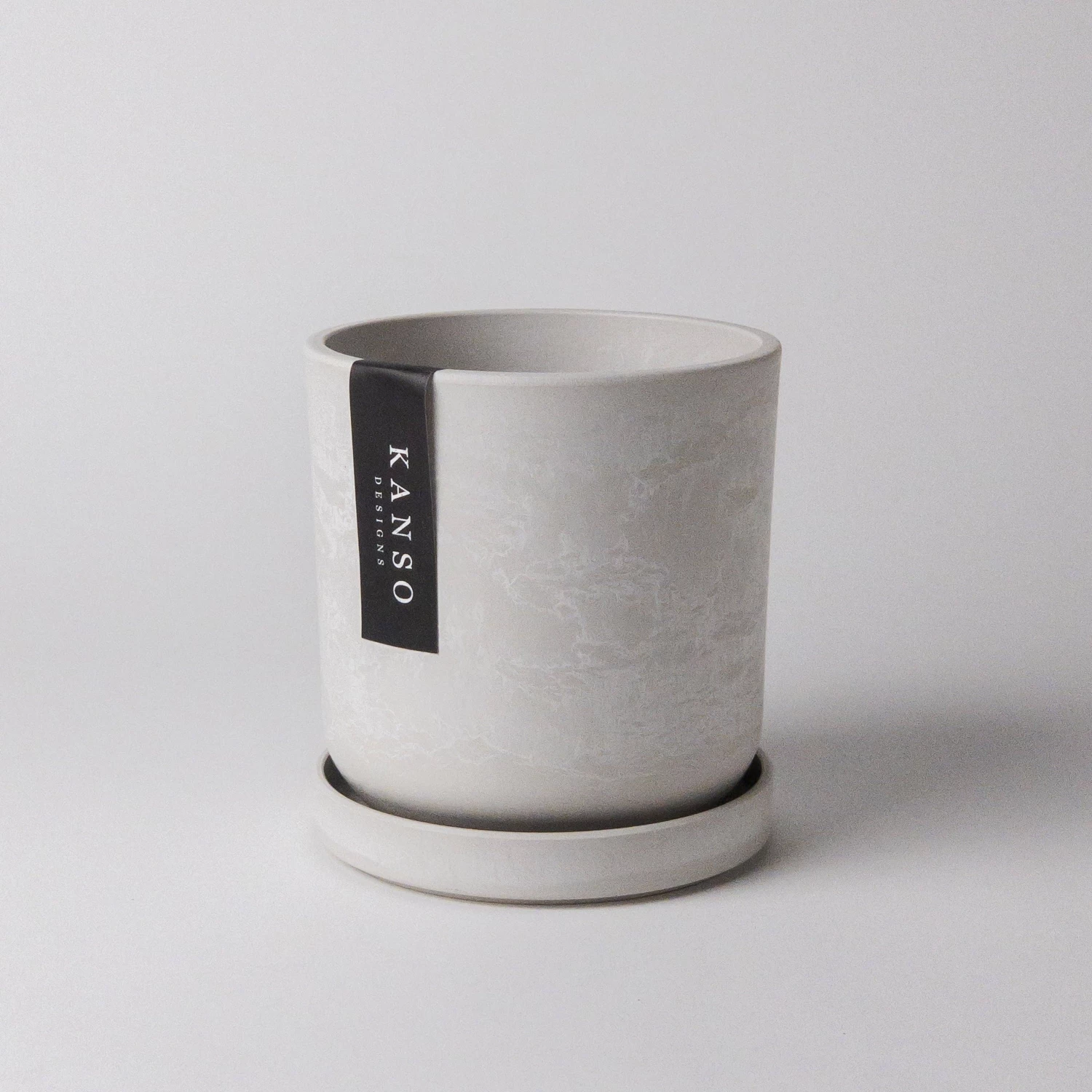 The planter from KANSO has a softly curved bottom with white stone finish and brings simple elegance to any space. For a contemporary look, pair full foliage plants like Pothos, Syngonium, or Polyscias Balfouriana.