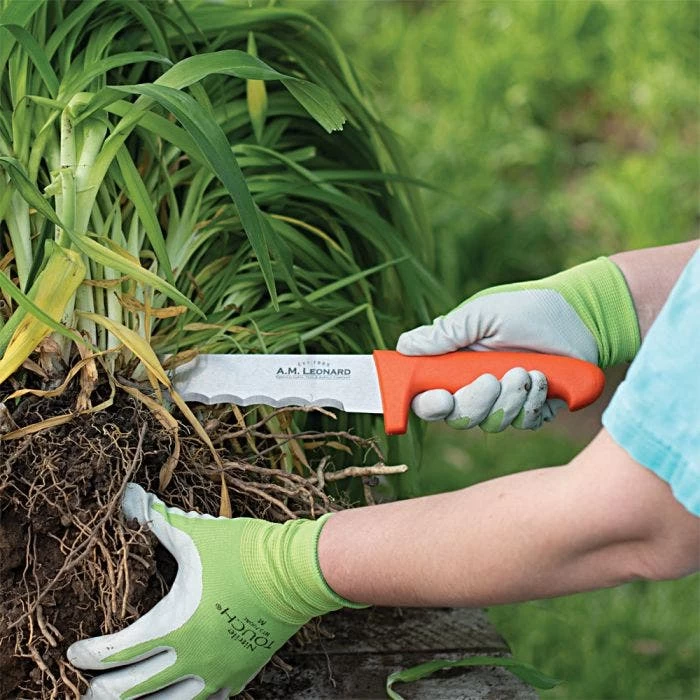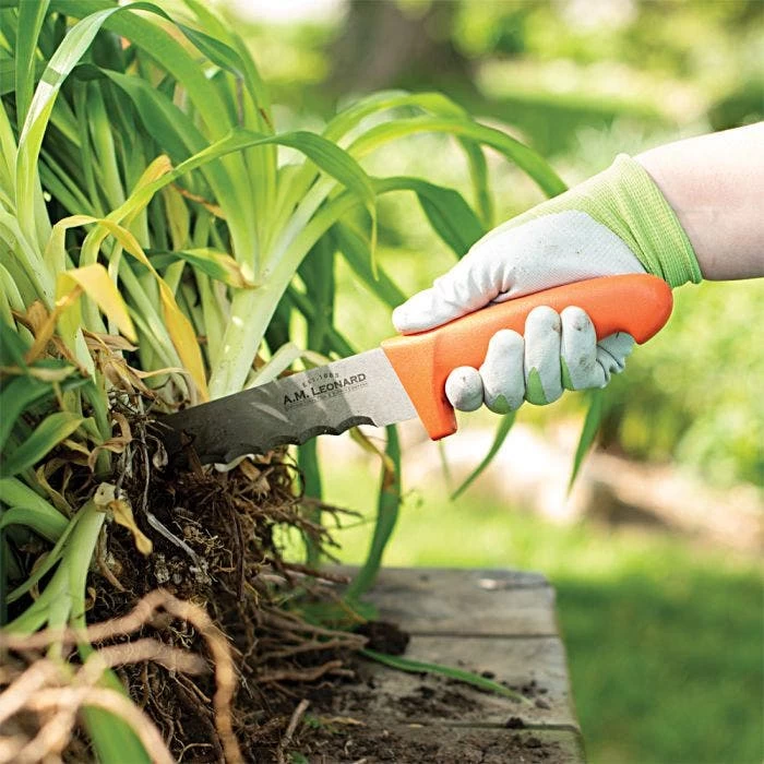 The Leonard Wavy Edge Stainless Steel Cut All Knife is perfect for harvesting vegetables, dividing perennials, cutting sod, or as a utility knife.