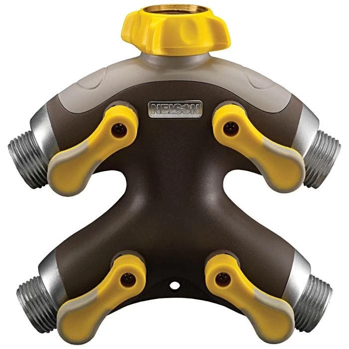The Nelson High Flow 4 Valve Faucet Adaptor can connect up to four hoses at the same time.