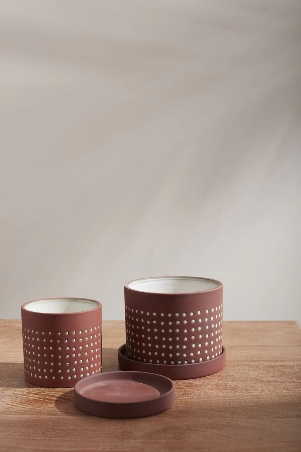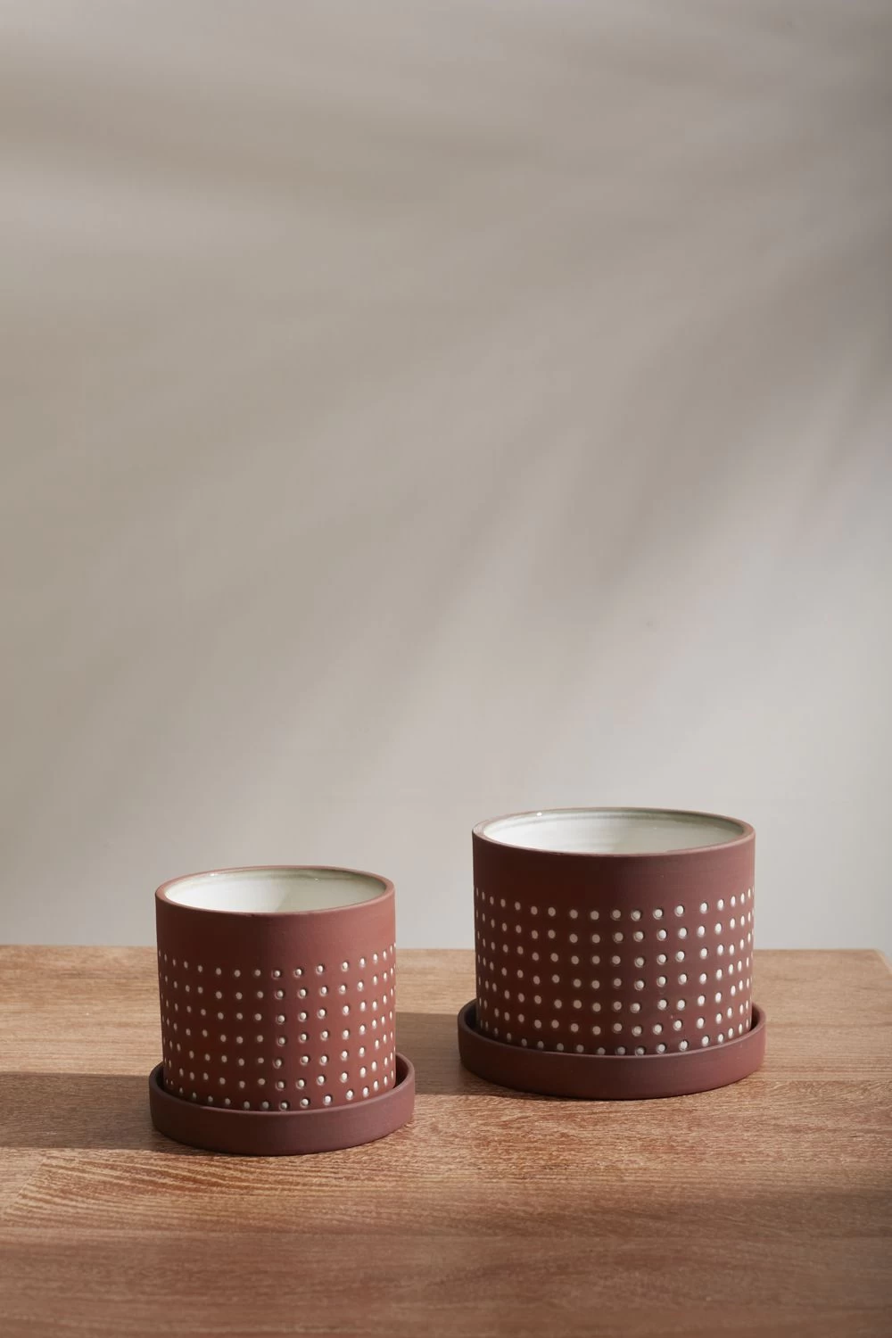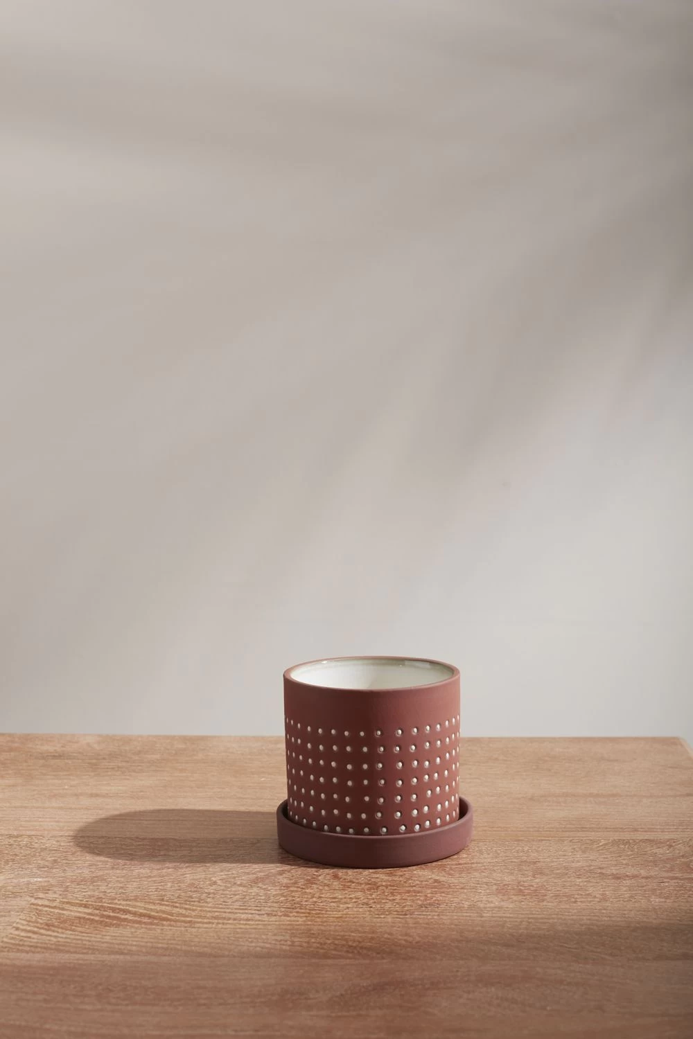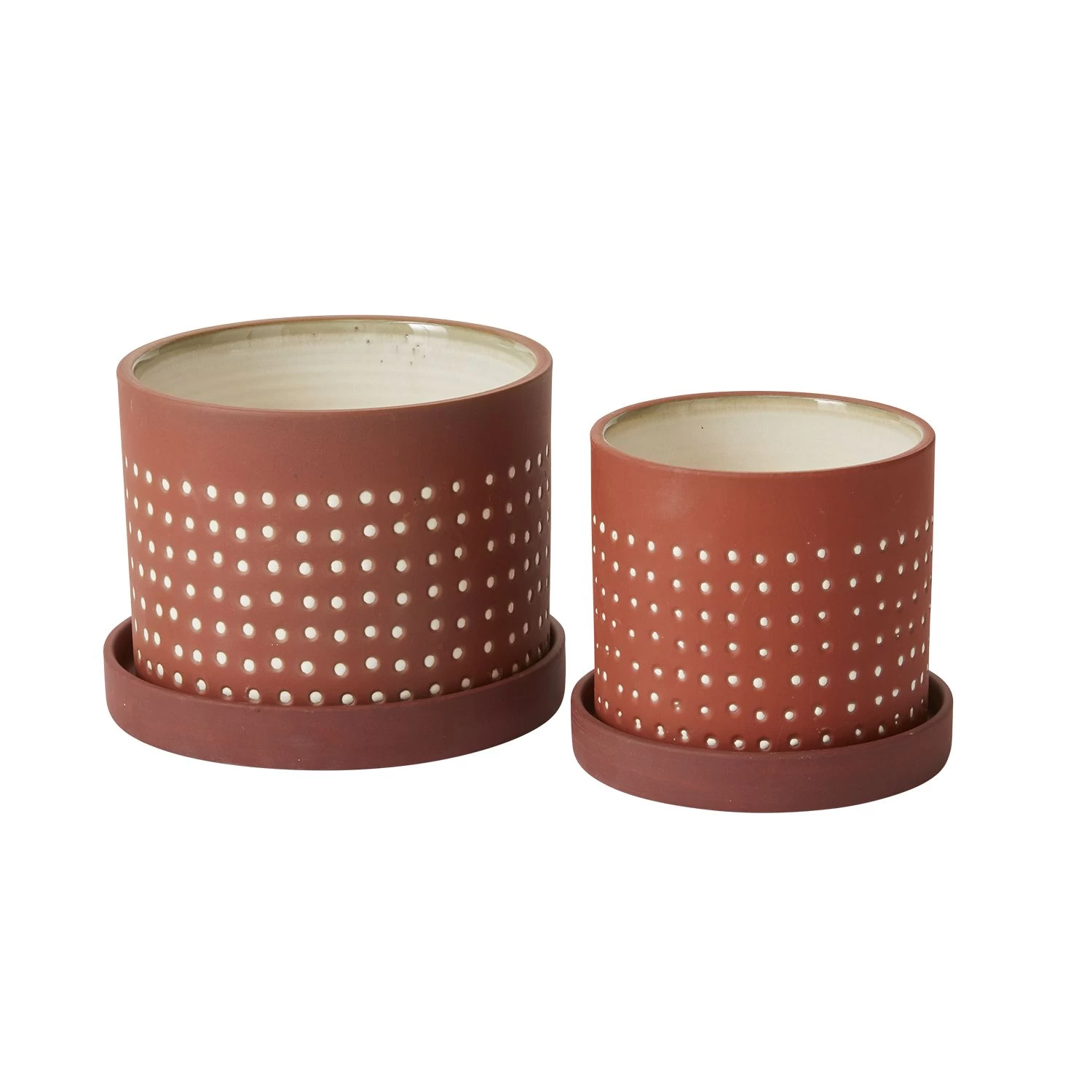 Warm up your surfaces with the earthy, understated hues of the Salamanca Pot. Ceramic with a natural terracotta exterior, a smooth white glazed interior & subtle textured white dot motifing, this classic shaped pot & saucer blends into any decor.
