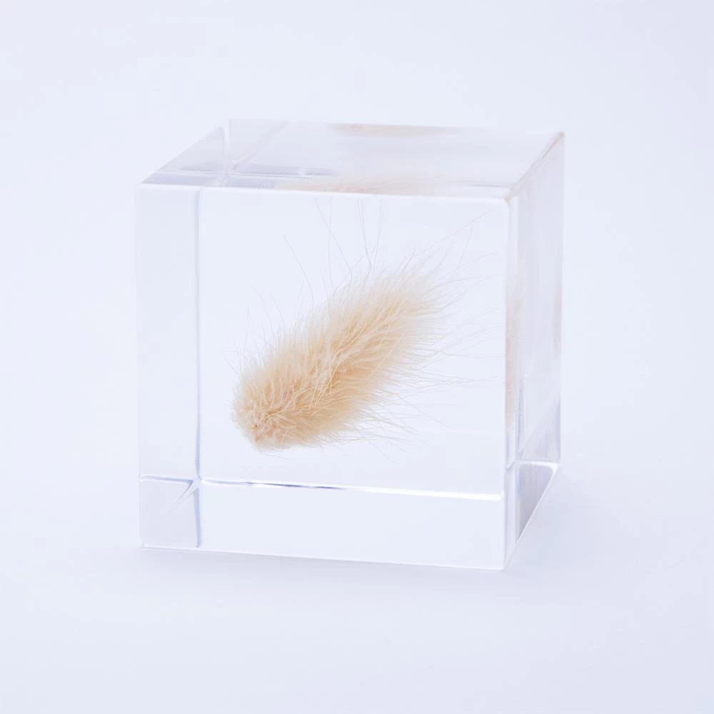 1.6 inch acrylic resin SOLA CUBE with bunny tail grass; made in Japan.