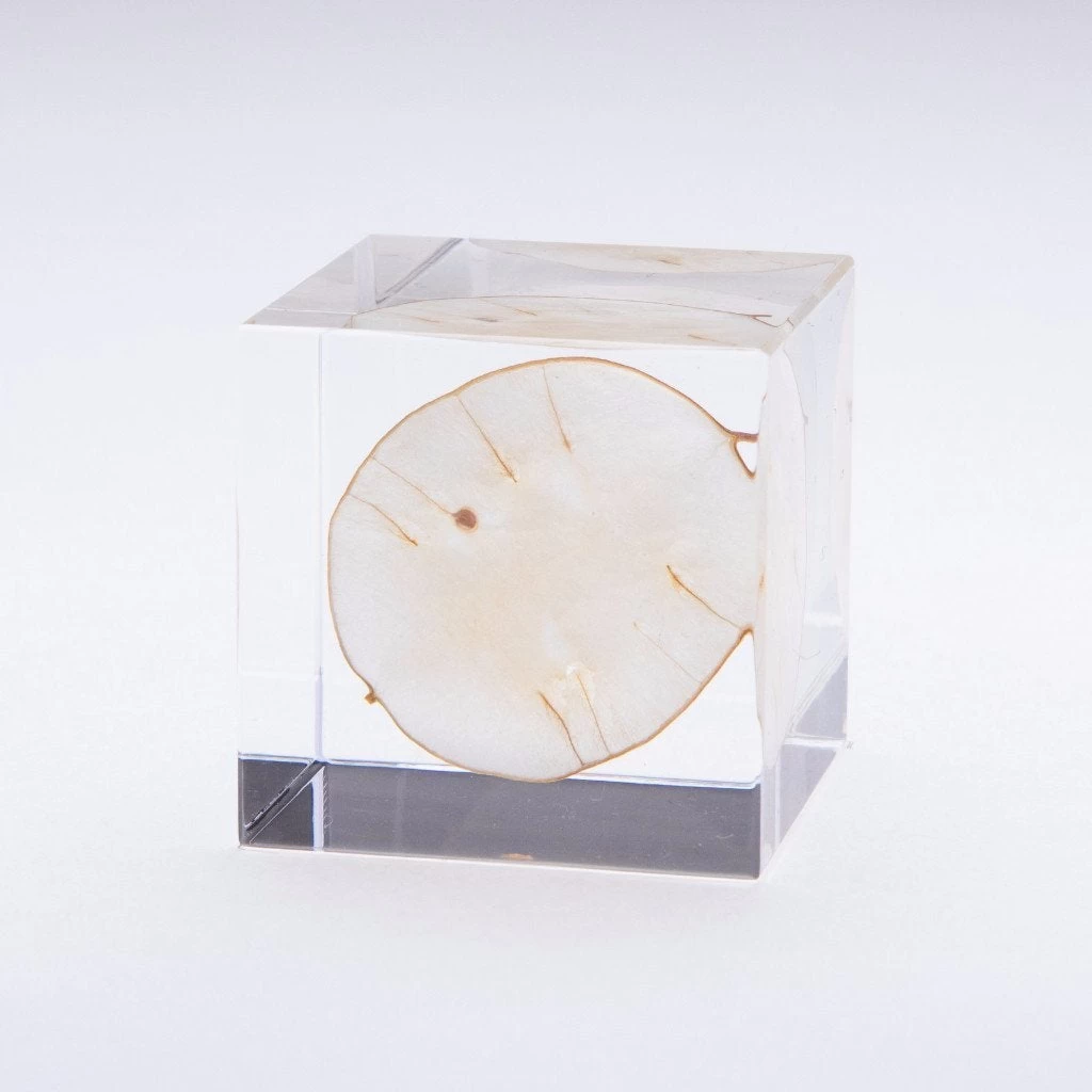 1.6 inch acrylic resin cube with preserved Lunaria annua made in Japan.