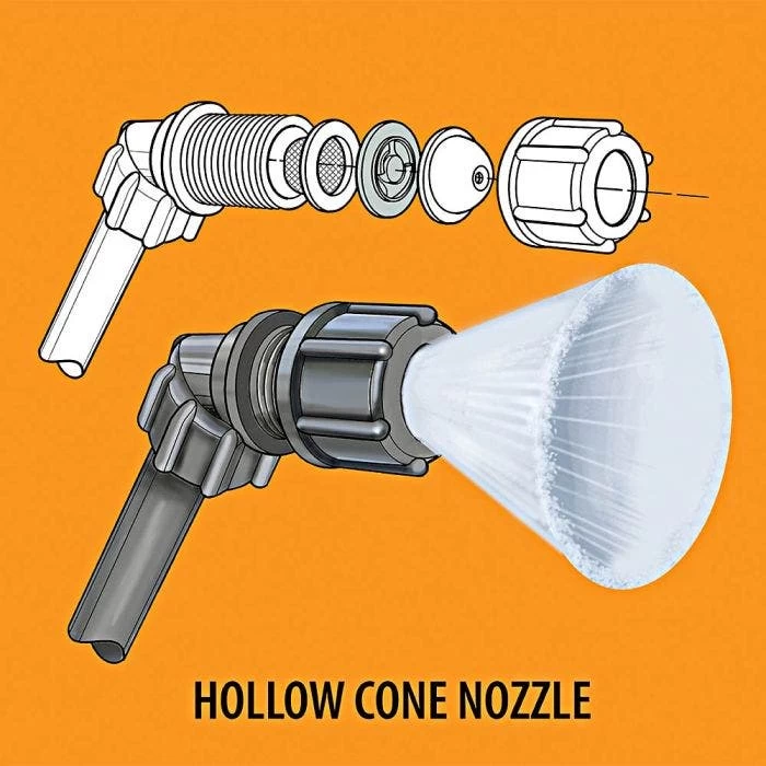 - Includes fan, hollow cone, jet stream, and plastic adjustable tips.