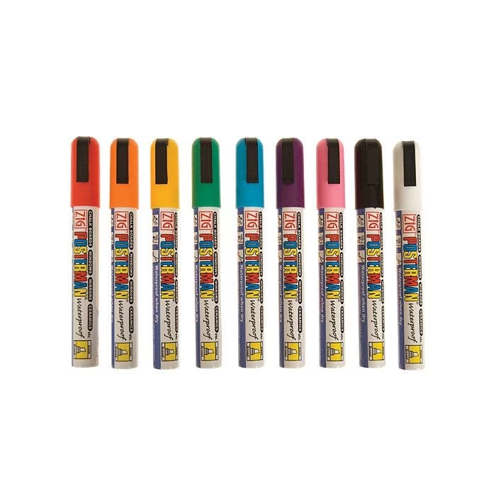 Ideal for any non-porous surface, these waterproof markers provide the means to create colorful displays that will stand out. They can save you money too! Simply wipe off your labels with a good quality household cleaner, like Formula 409, and they are ready to use again. Set of 9 markers includes red, orange, yellow, green, blue, purple, pink, black, and white.