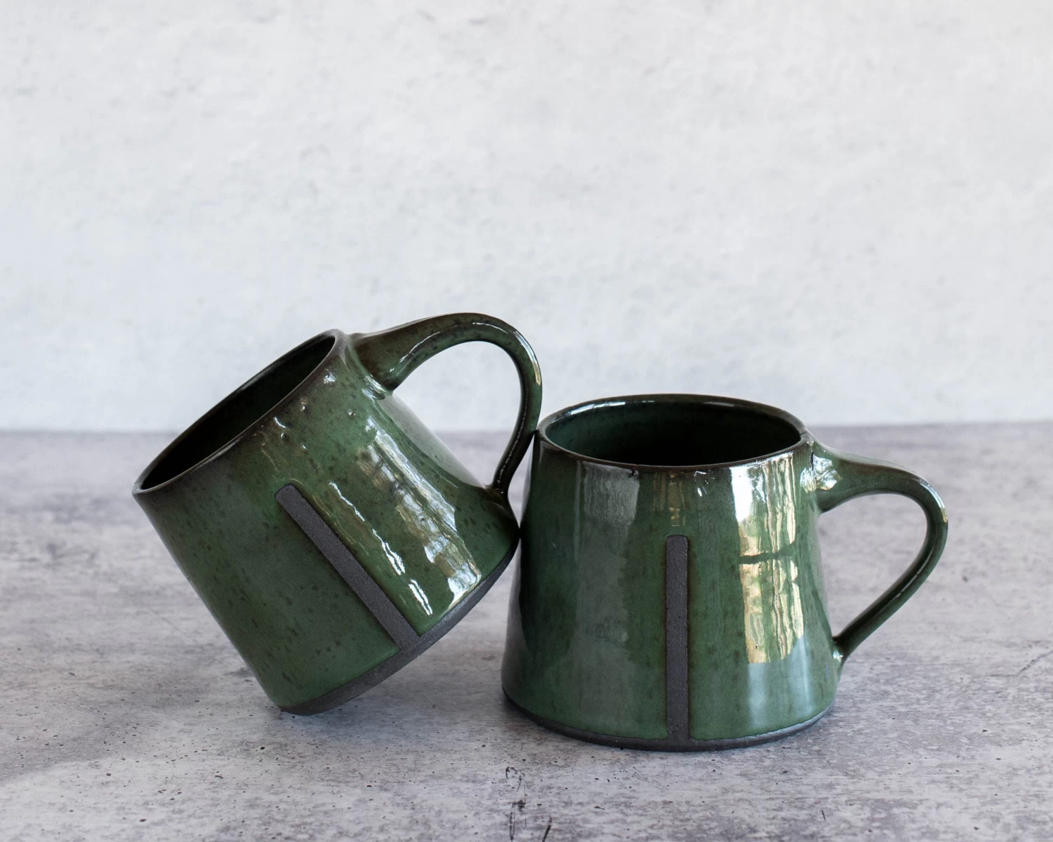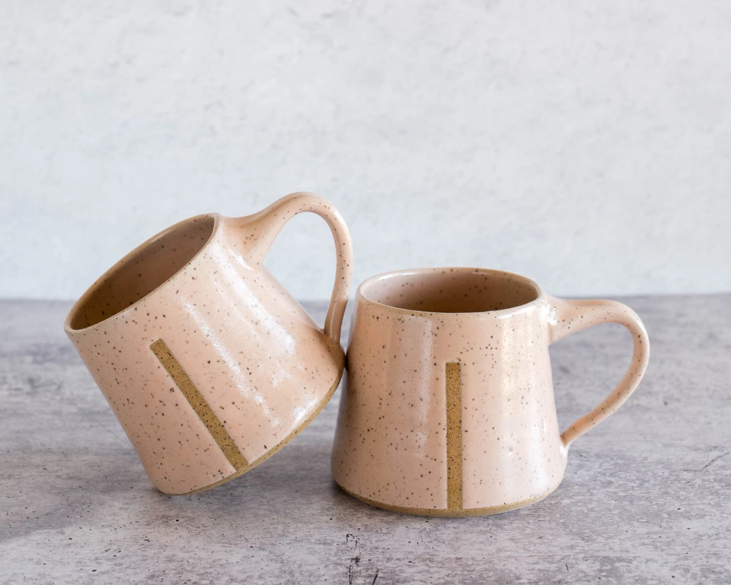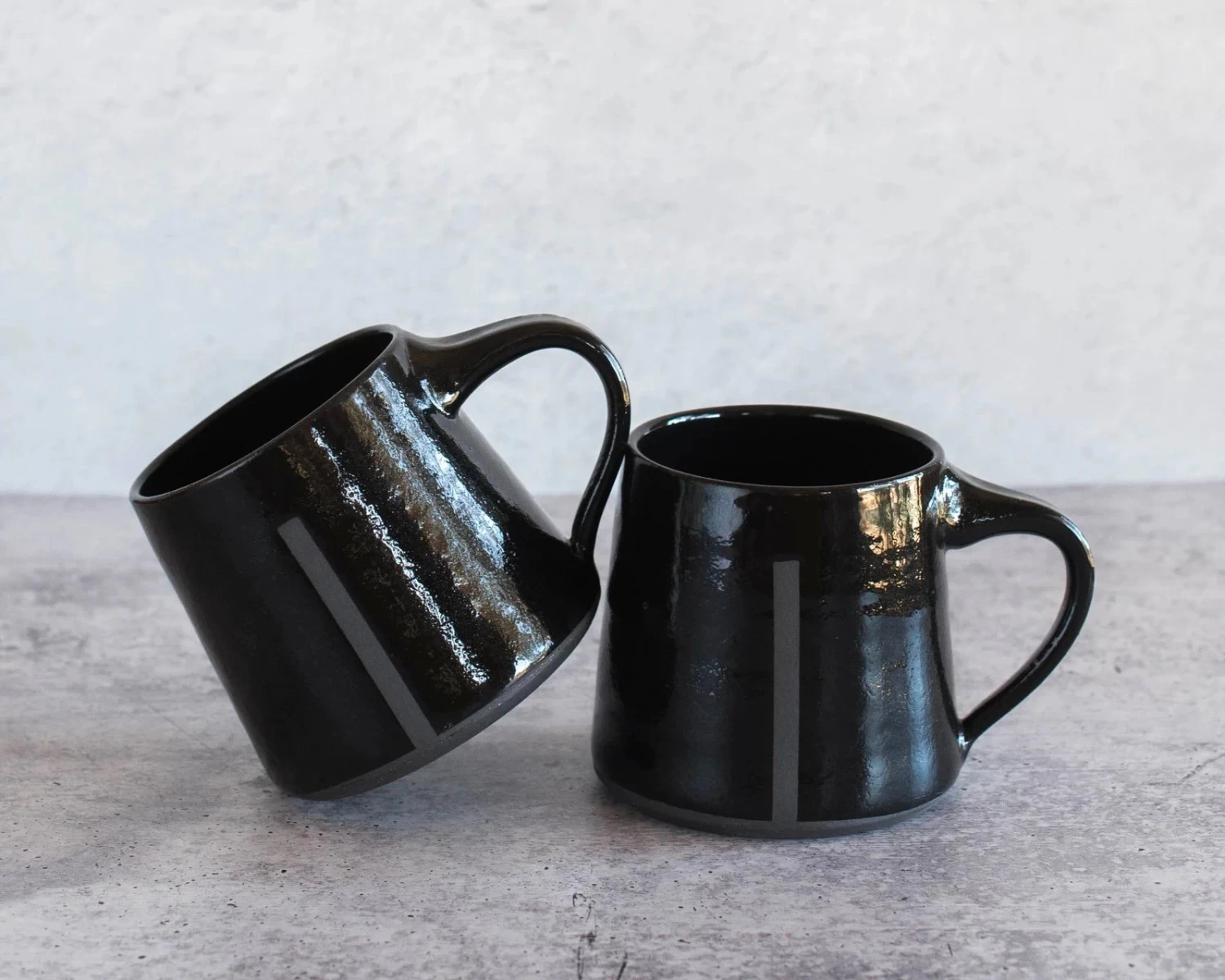 Bring a bit of Joshua Tree into your kitchen! These simple yet elegant ceramic coffee mugs feature glazes and clays that are inspired by the colors of the California high desert. Although the mug is lightweight, it has a wide base and straight walls, making it sturdy and hard to knock over. They have a graceful pulled handle that feels great in your hand, and the sides have a minimalist vertical stripe revealing the clay body underneath the glaze. Each mug is made by hand, and therefore the size and shape will vary slightly. Great as a gift, and any of the white glazes are a universal favorite!